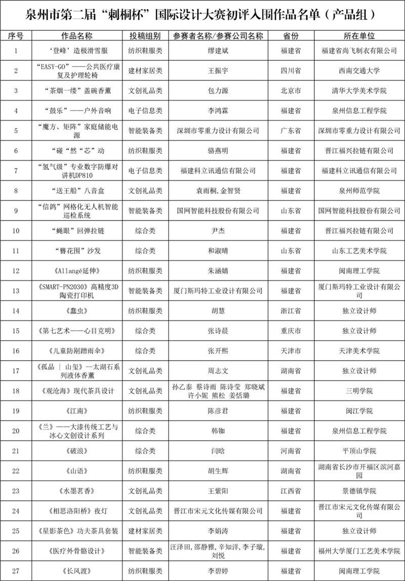由福建省工业和信息化厅、泉州市人民政府指导的,泉州市丰泽区人民政府、泉州市工业和信息化局、泉州市人力资源和社会保障局、泉州市总工会主办的泉州市第二届“刺桐杯”国际设计大赛,在首届大赛,31个国家参与征集10733件设计作品的基础上,继往开来,持续推动泉州“制造赋能”向“设计赋能”拓展。大赛设有百万奖金,配套人才政策、落地服务等六大福利。在征集期内共收到全球设计作品12106件,企业、机构、院校、个人及团队参赛热情高涨。