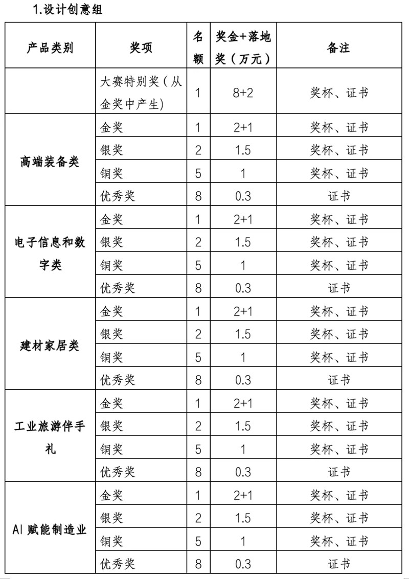 注1:特别奖以及金奖获奖作品两年内落地漳州并实现量产后兑现落地奖金;以个人名义参赛的获奖作品主创人员两年内在漳州就业、创业的视为作品落地。