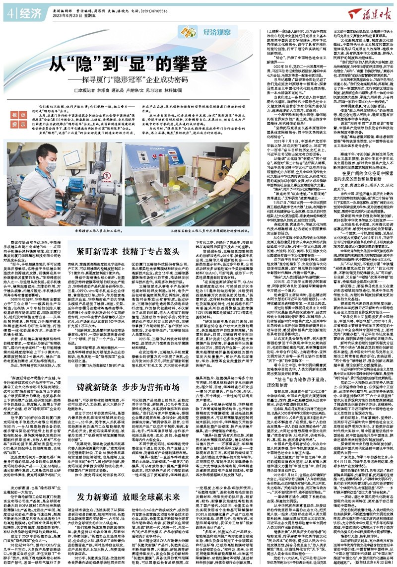 6月23日,《福建日报》04 经济版大篇幅报道《从“隐”到“显”的攀登——探寻厦门“隐形冠军”企业成功密码》一文,对厦门华晔精密科技有限公司、厦门三德信科技股份有限公司、厦门麦克玛视电子信息技术有限公司、厦门长塑实业有限公司4家隐形冠军企业进行宣传报道,展示这些企业的独到之处。